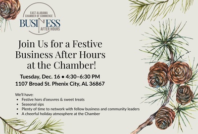 Join the East Alabama Chamber of Commerce for Holiday Business After Hours, our signature monthly networking social designed to connect local professionals in a relaxed, come-and-go setting.