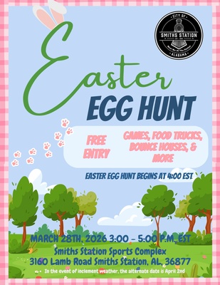 Easter Egg Hunt at the Smiths Station Sports Complex March 28 from 3-5 PM ET. It's free and open to the public. There will be games, food trucks, bounce houses, and more.